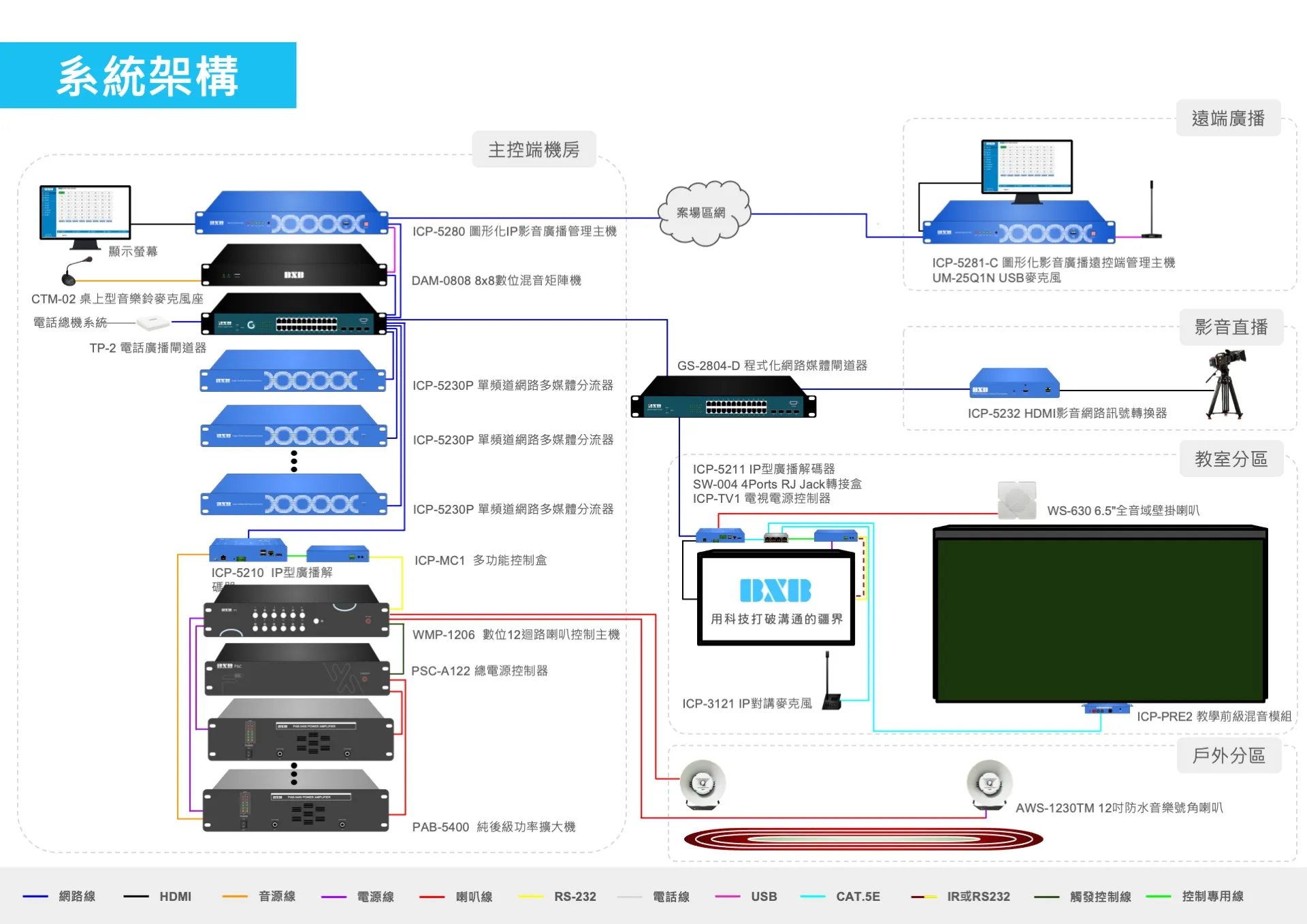 BXB ICP-5200 IP影音分佈式多媒體發布系統應運而生,滿足這一需求。系統整合物聯網、大數據、影音串流和雲端技術,支持高畫質視訊和清晰音頻串流,具有低延遲和同步播放特性。無論在智慧校園、百貨公司、工廠、機場、車站、飯店、社區還是緊急應變指揮中心,ICP-5200提供即時、可靠和高效的廣播解決方案。