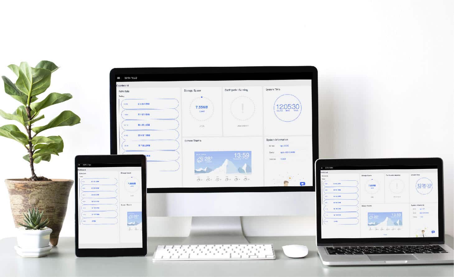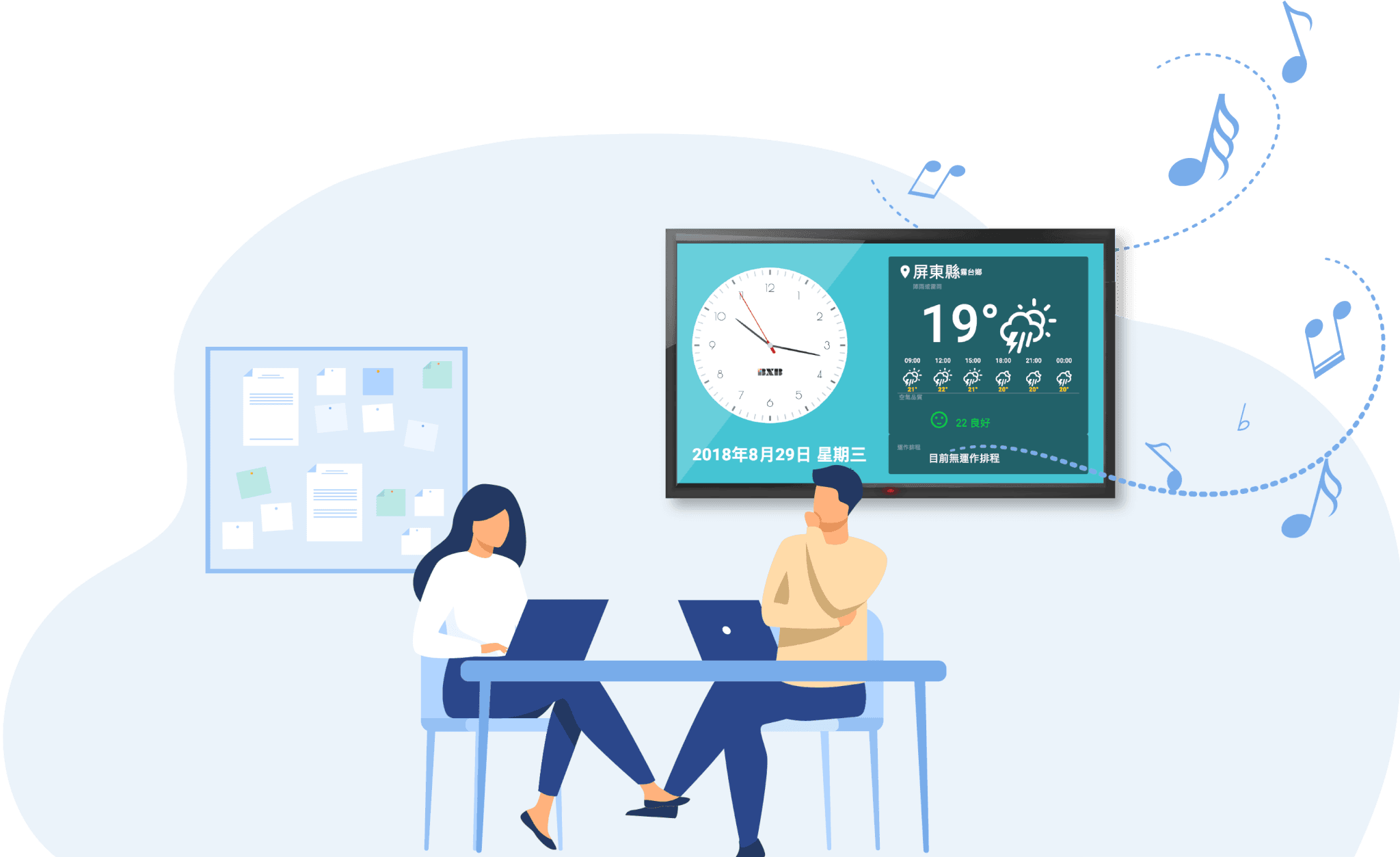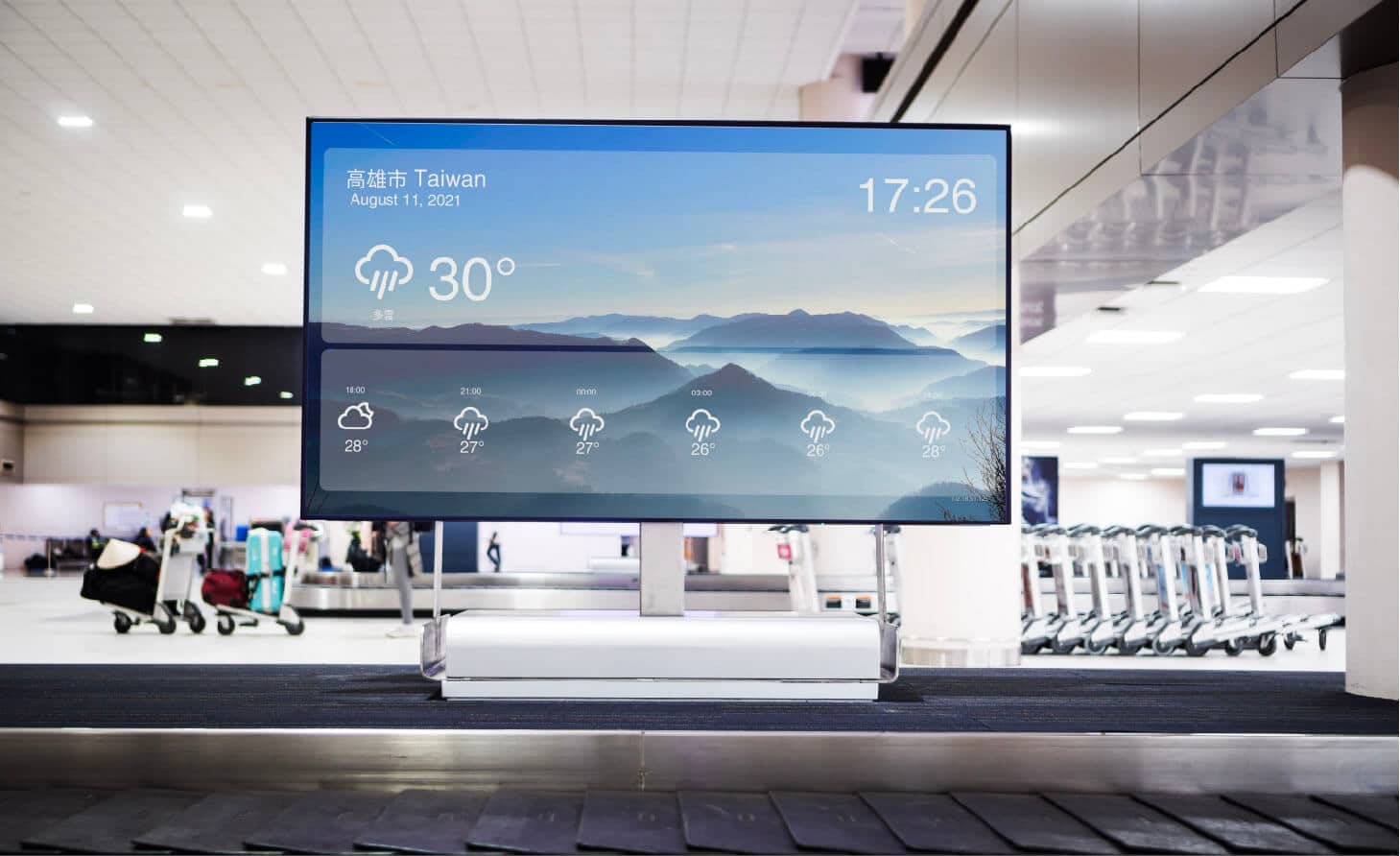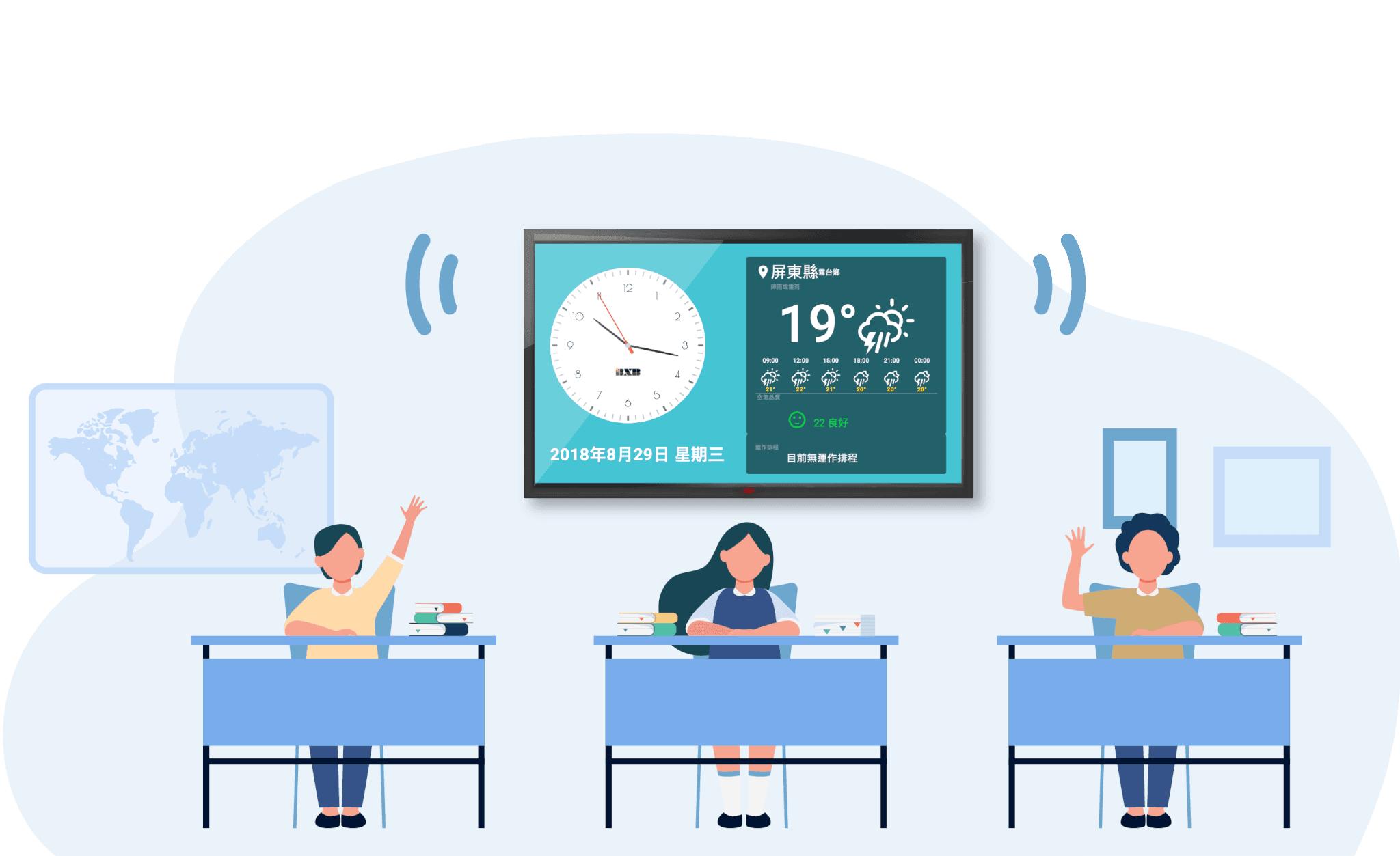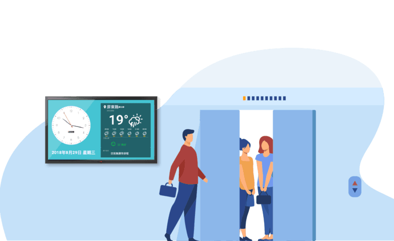 HDMI 輸出畫面可同步顯示本地時間、天氣、空氣品質等資訊;亦可依環境風格,自由設計顯示畫面的版型