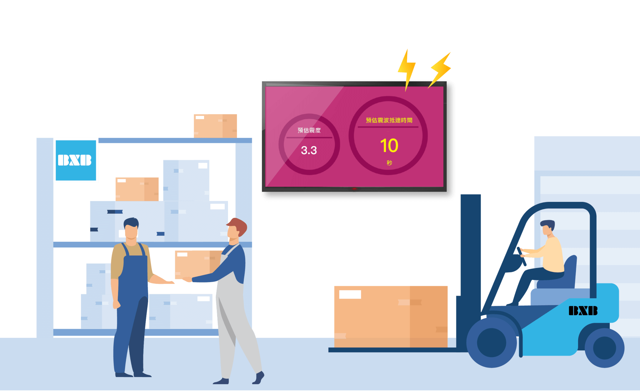 地震來臨時,BXB 地震伺服器將透過網路主動發送緊急通知,除了聲音警報外,也可透過預設的預警畫面,提醒相關人員進行防護措施,守護人身安全